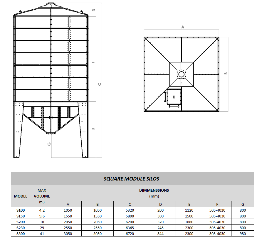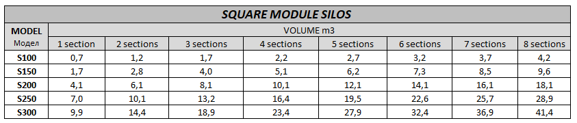 Капацитет: Единичен максимален капацитет 40 кубични метра до над 1000 м³ в силозна батерия, според конфигурацията