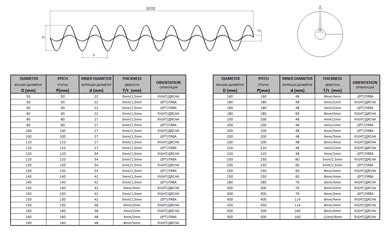 Те се заварят и се въртят около ос и чрез винтовото движение придвижват материала по тръба или канал.
